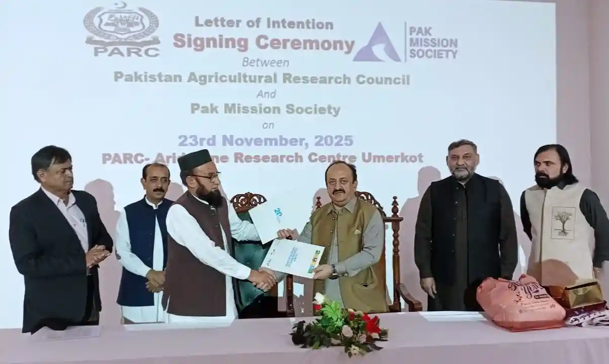 Pak Mission Society (PMS) and the Pakistan Agricultural Research Council (PARC) have signed a Letter of Intent (LOI) at the Arid Zone Agriculture Research Center in Umerkot to strengthen collaboration in cooperative research, scientific communication, technology innovation, and capacity building. Through this partnership, PMS and PARC aim to bring climate-smart solutions directly to farming communities by establishing orchards with drought-resilient varieties and developing two fish farms that can thrive in high-salinity water areas.