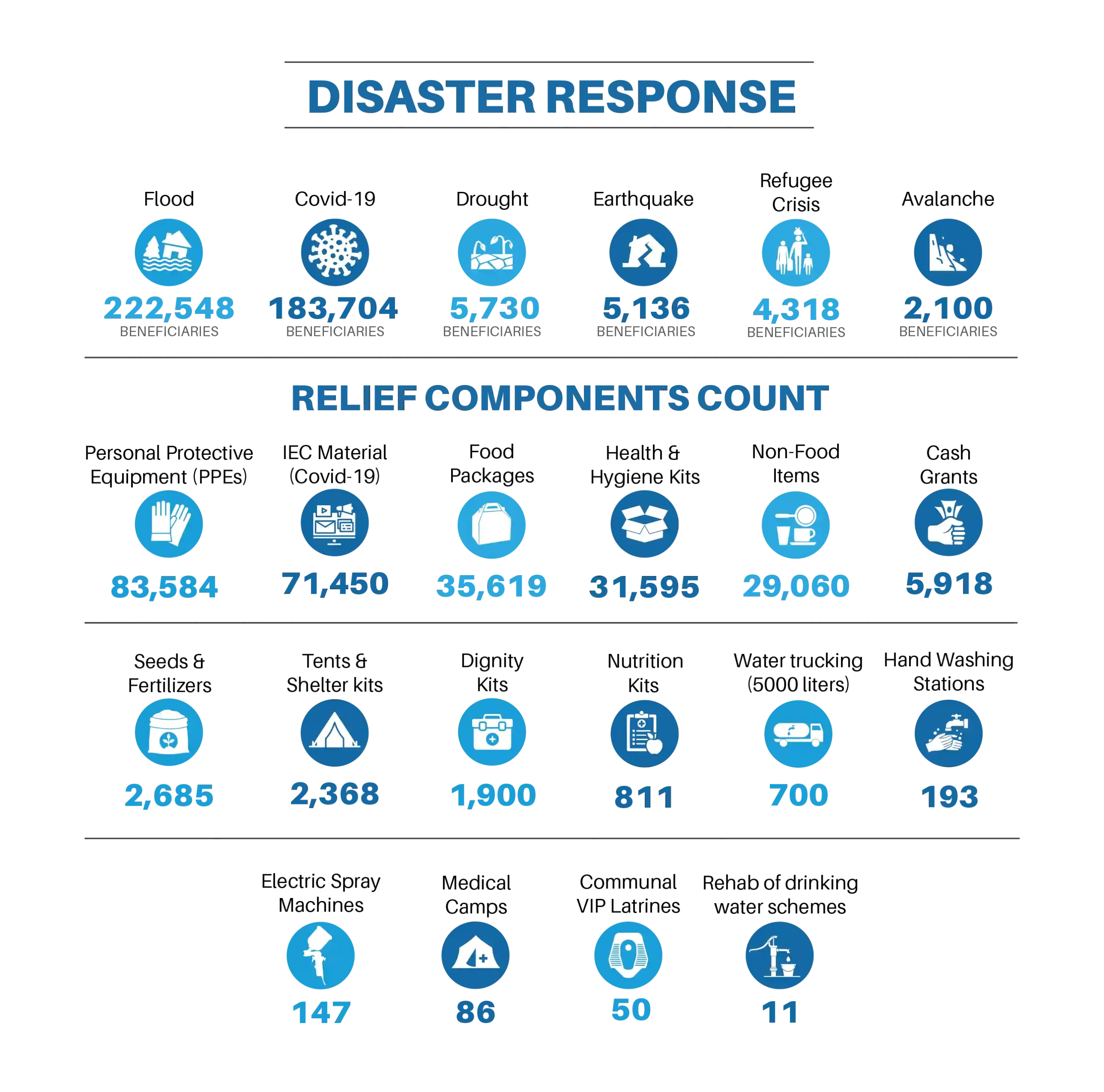 Emergency relief and recovery support in crisis-affected regions, providing immediate assistance and long-term rehabilitation.