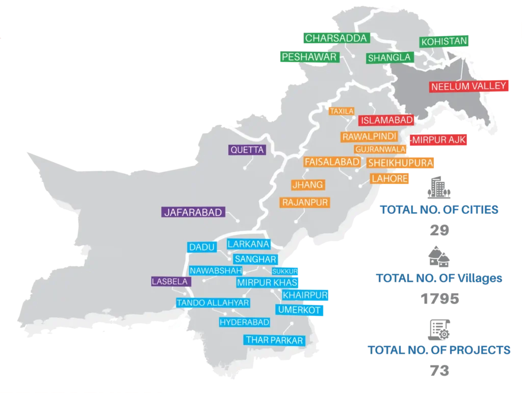 Pak Mission Society (PMS) works across all four provinces of Pakistan, with field offices based in some of the most hard-to-reach and disaster-prone areas. Through these offices, we deliver projects in a wide range of communities—from the northern regions like Charsadda, Peshawar, Shangla, Kohistan, and Neelum Valley, to major cities and districts across Punjab, Sindh, and Balochistan, including Karachi, Multan, Umerkot, Sanghar, Hyderabad, Tharparkar, Quetta, Lasbela and Jaffarabad.